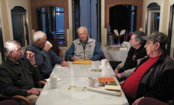 Coffee Club members: Edward Jaatteenmaki, Bill Belton, Ernie Ottewell, James V. Walford and Clarence (Clancy) L. Boettger (left to right)Photo by Jennifer Dunkerson