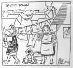 New Canadian caricatures by Frank Moritsugu show the contrast between the realities of Ghost town life and the Young Eastern Relocee's Conception of the Ghost Towns.